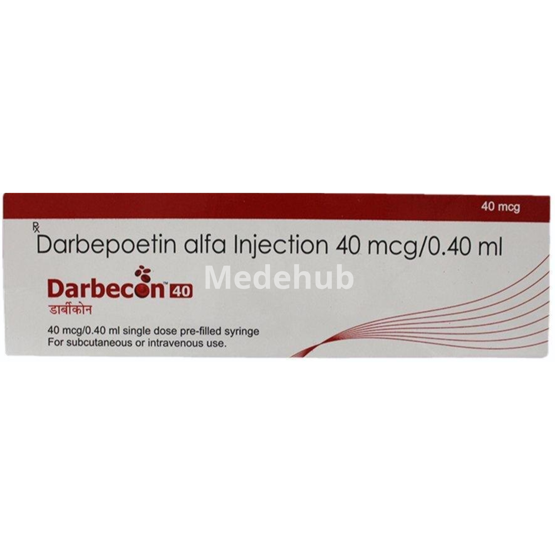 Darbecon 40mcg Injection contains darbepoetin alfa, a hematopoietic growth factor classified under antineoplastic agents. It is primarily used to treat anemia (low red blood cell count) associated with chronic kidney disease. It is also prescribed to manage anemia caused by chemotherapy in patients with certain types of cancer. Common symptoms of anemia include fatigue, weakness, and shortness of breath.