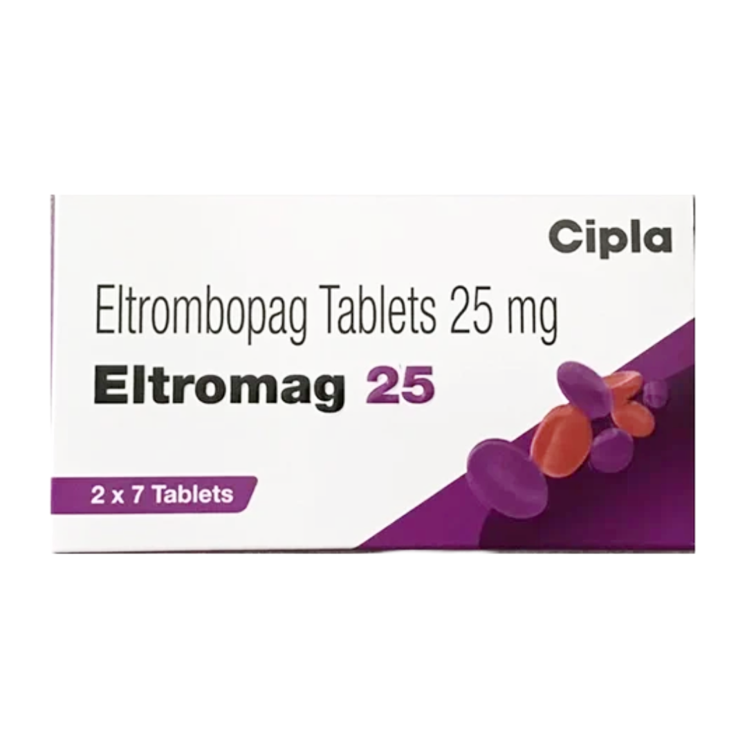 Eltromag 25mg Tablet is an anticoagulant medication classified as a thrombopoietin (TPO) receptor agonist. It contains the active ingredient Eltrombopag and is primarily prescribed to treat low platelet counts in conditions such as primary immune thrombocytopenia (ITP) or hepatitis C virus (HCV) infection. ITP is an autoimmune disorder where the immune system mistakenly destroys platelets—cells essential for blood clotting and maintaining the integrity of blood vessels. A reduction in platelet levels can lead to excessive bruising and severe bleeding.