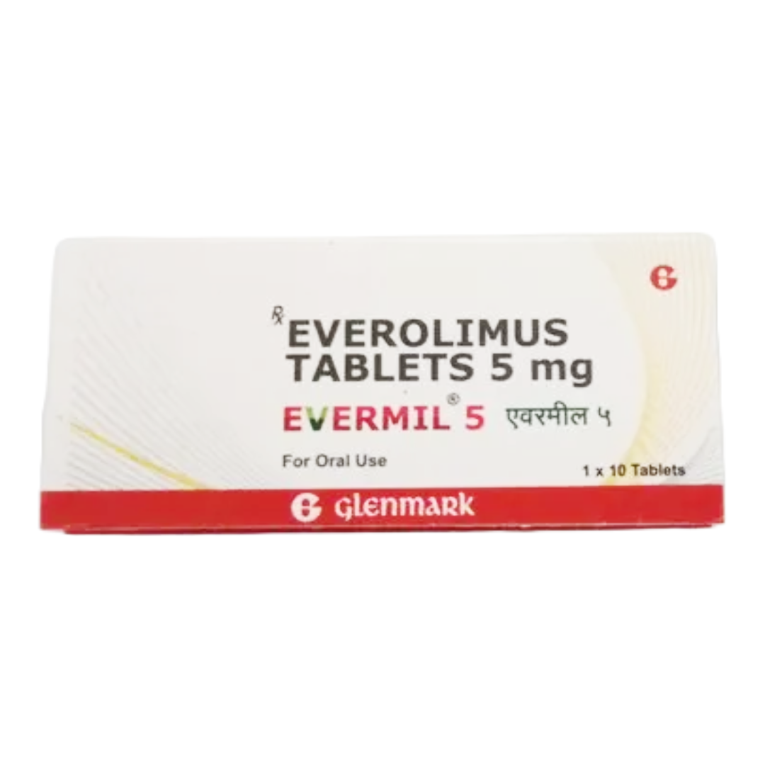 Evermil 5mg tablet is an antineoplastic medication from the mTOR kinase inhibitor class, containing the active ingredient everolimus. It is prescribed for the treatment of advanced breast cancer, renal cell carcinoma, pancreatic neuroendocrine tumors, and subependymal giant cell astrocytoma—a type of brain tumor located in the brain’s ventricles. Since this medicine can cause mouth sores or ulcers, maintaining good oral hygiene and attending regular dental check-ups is strongly recommended during treatment. Evermil is often used in combination with cyclophosphamide, an alkylating agent, particularly for managing subependymal giant cell astrocytoma.