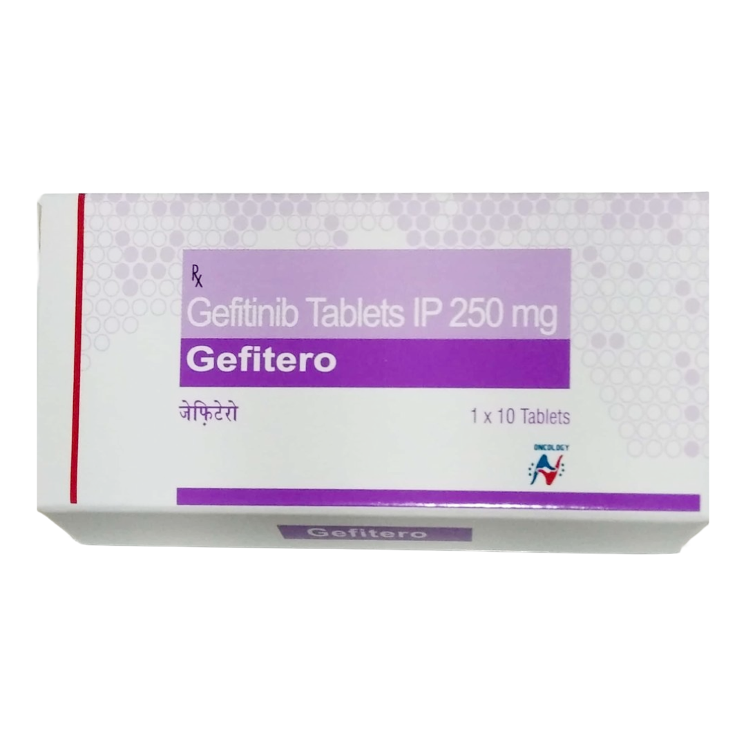 Gefitero 250mg Tablet is an antineoplastic medicine belonging to the class of tyrosine kinase inhibitors, containing the active ingredient gefitinib. It is prescribed for the treatment of non‑small cell lung cancer (NSCLC), a condition in which abnormal cells grow and multiply uncontrollably in the lung tissue. This medicine is used in patients whose cancer has spread to other parts of the body, who carry specific abnormal epidermal growth factor receptor (EGFR) genes, and who have not previously received cancer treatment.