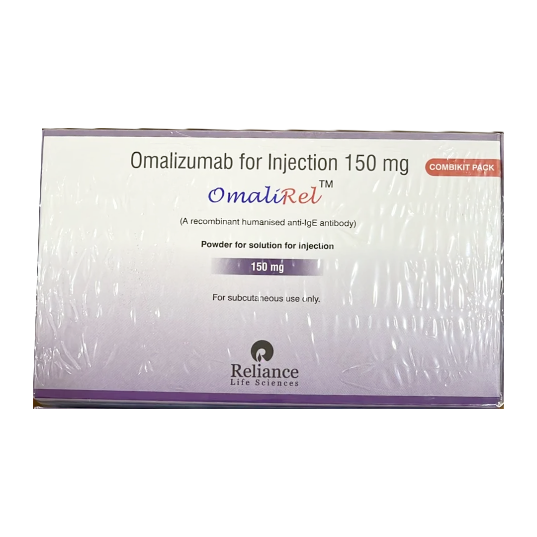 Omalirel 150mg Injection contains Omalizumab, a monoclonal antibody used to treat allergic asthma, chronic rhinosinusitis with nasal polyps, and chronic spontaneous urticaria (CSU). Inform your doctor if you are allergic to Omalirel or any of its ingredients, especially if you have a latex allergy, as the syringe needle cap may contain latex.