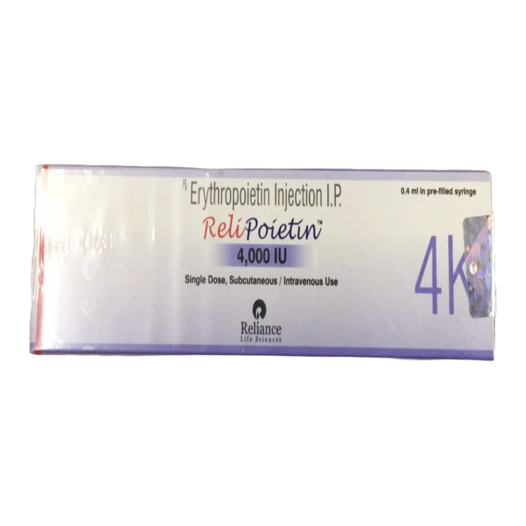 Relipoietin 4000 IU Injection is a medication that stimulates the bone marrow to produce more red blood cells. It is commonly prescribed to treat anemia caused by chronic kidney disease, cancer chemotherapy, or HIV treatment.