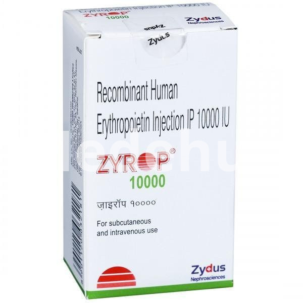 Zyrop 10000IU Injection contains the active ingredient recombinant human erythropoietin alfa (epoetin alfa), a medication classified as an erythropoiesis-stimulating agent (ESA). It is used to treat anemia associated with chronic kidney disease (CKD), cancer chemotherapy, or HIV treatment with zidovudine. Additionally, it can help reduce the need for red blood cell transfusions in patients at high risk of blood loss due to planned surgery or other medical procedures.